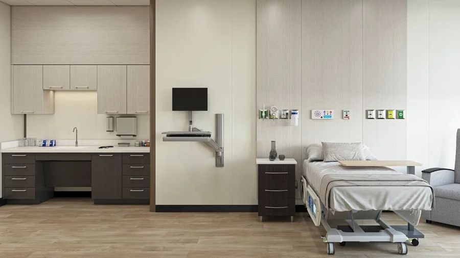 In addition to adaptability, Teknion’s system provides a fully integrated infrastructure within the walls themselves. Healthcare spaces require a wide range of built-in components, including electrical connections, data ports, equipment rails, plumbing pathways, and cabinetry. Rather than treating these as separate installations, Teknion’s architectural interior system incorporates them into a single coordinated framework. This approach helps streamline installation and creates clean, organized clinical environments that support efficient workflows for healthcare professionals.